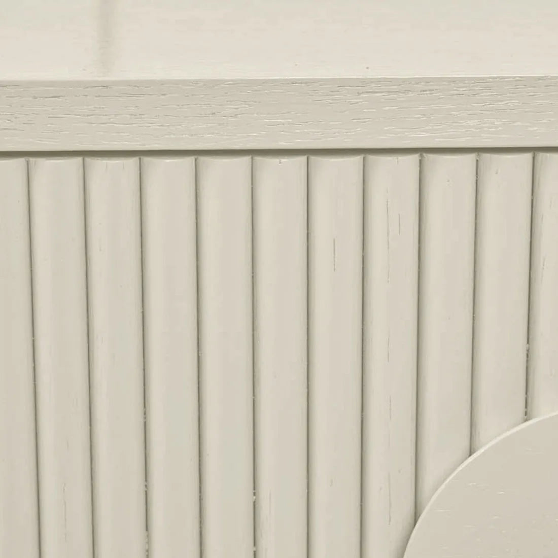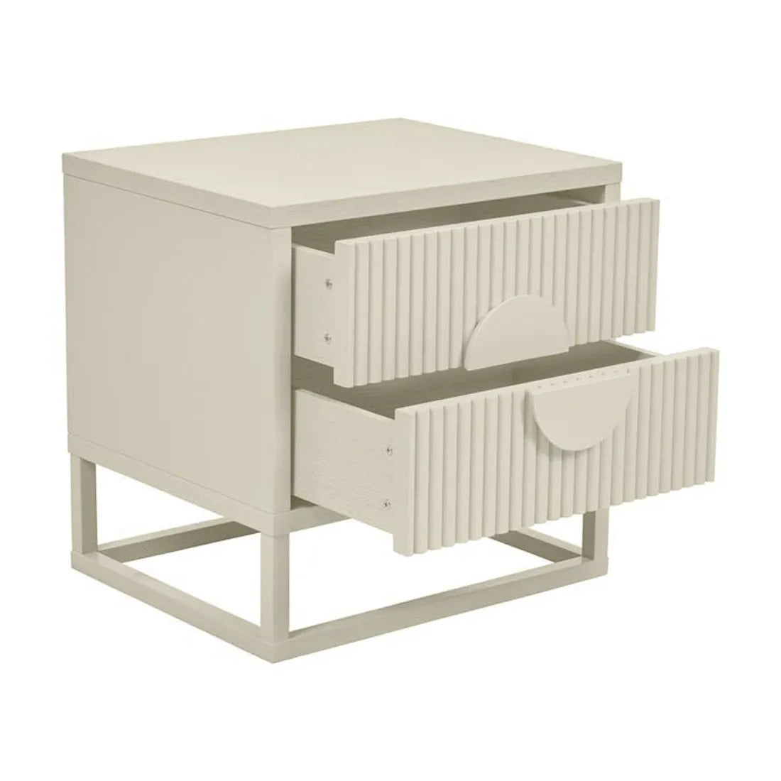 The Benjamin Ripple Bedside exudes bold tactility and unique character, making it a standout accent piece. Crafted from sturdy timber, it features clean, minimalistic lines and a sleek geometric frame. The eye-catching ripple motif and signature button handle add textural interest, while two drawers and ample top surface provide generous space for everyday essentials.