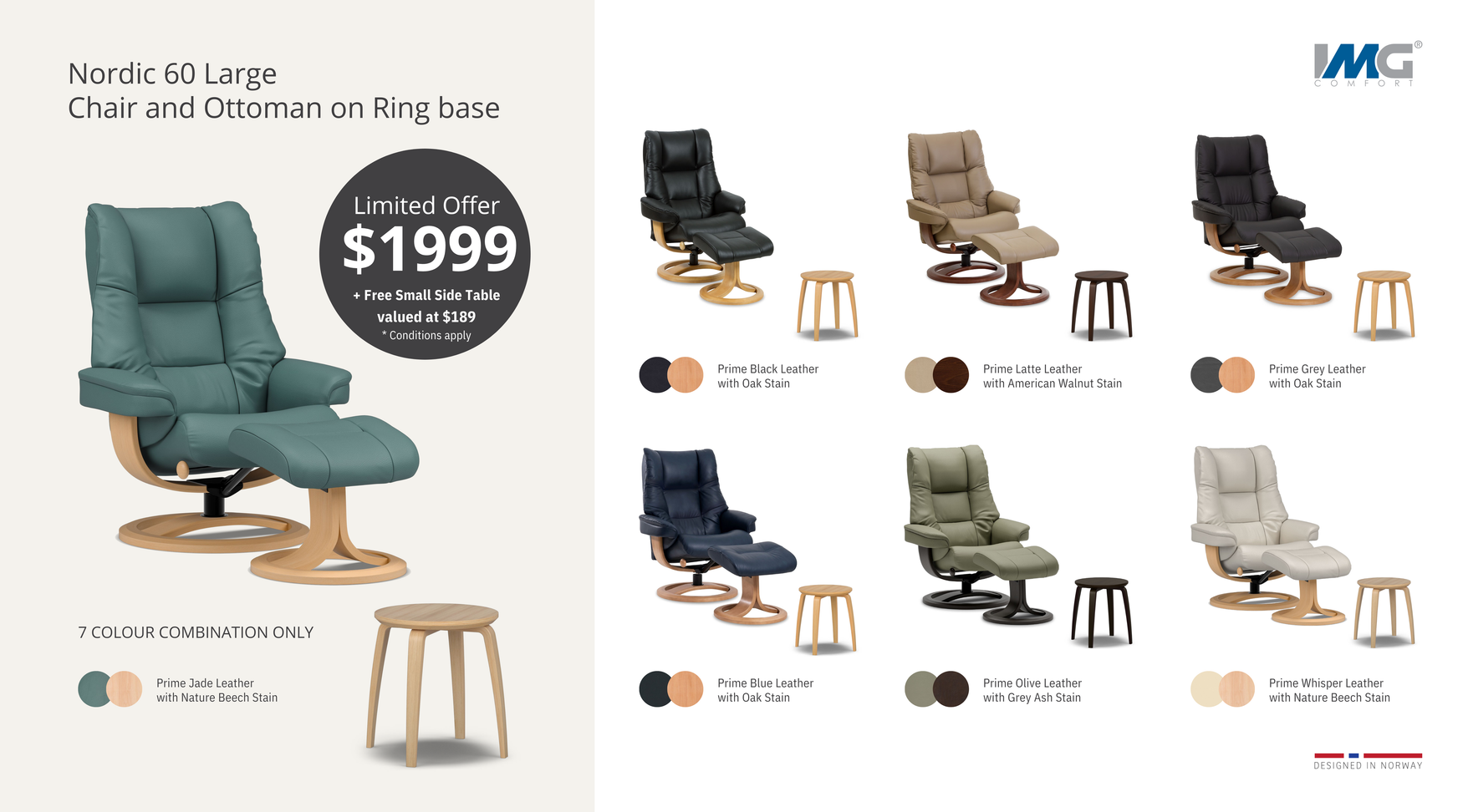 Experience true Nordic comfort with the IMG Nordic 60L Recliner with Free Side Table Bundle, available for a limited time only. Crafted with a laminated wood yoke, solid steel frame, and high resilience cold cure molded foam, this recliner ensures superior stability, durability, and lasting support. Upholstered in luxurious Prime Leather that is soft, even in texture, and easy to clean, it offers both elegance and practicality. With its sleek Scandinavian design and ergonomic build, the Nordic 60L provides unmatched relaxation, and for a limited time, comes with a free side table that perfectly complements your recliner. Visit our showroom to explore a range of leather and fabric colours and experience the essence of Nordic living.